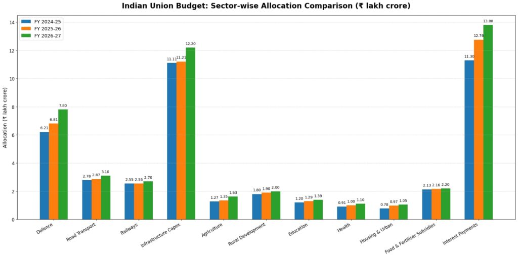 The chart presents a sector-wise comparison of Indian Union Budget allocations across FY 2024-25, FY 2025-26, and FY 2026-27 (in ₹ lakh crore). It highlights a clear upward trend in overall government spending, with Infrastructure Capex and Interest Payments emerging as the largest expenditure components. Defence shows a strong and consistent increase, reflecting strategic and security priorities. Social sectors such as Education, Health, Agriculture, and Rural Development record steady but moderate growth, indicating sustained welfare focus. Transport sectors Roads and Railways remain stable with gradual expansion. Overall, the visual underscores the government’s emphasis on capital investment, fiscal consolidation, and balanced sectoral development over the three-year period.
