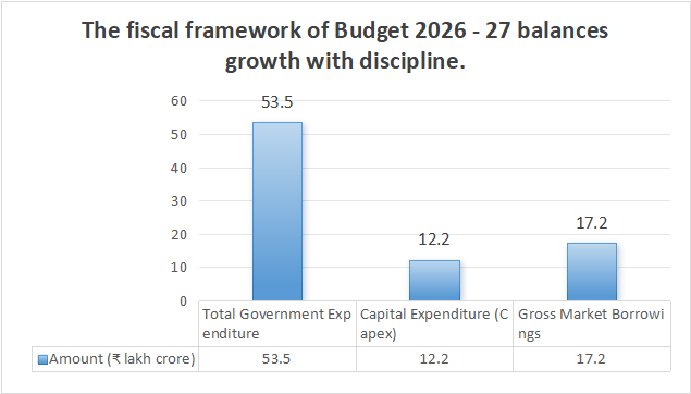 In the Union Budget 2026‑27, the fiscal deficit is targeted at 4.3% of GDP, reflecting the government’s commitment to maintaining fiscal discipline while supporting growth. Total government expenditure is projected at ₹53.5 lakh crore, with a significant focus on development spending. Of this, capital expenditure (Capex) accounts for ₹12.2 lakh crore, underscoring the emphasis on infrastructure and long-term asset creation. To finance these outlays, the government plans gross market borrowings of ₹17.2 lakh crore, balancing the need for investment with fiscal prudence and ensuring sufficient liquidity in the economy to support growth-oriented programs.
